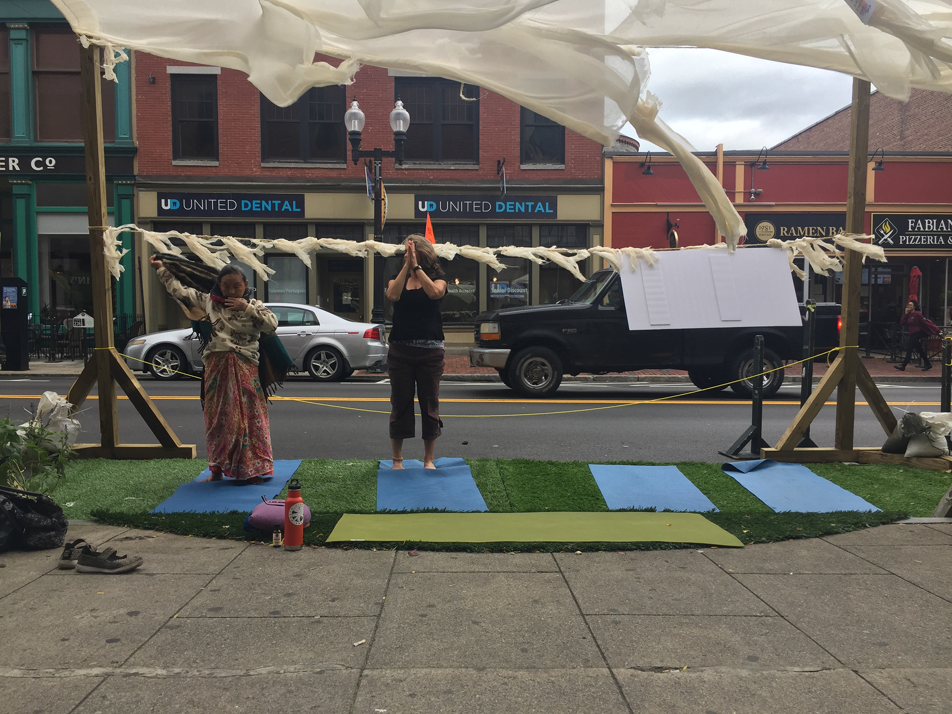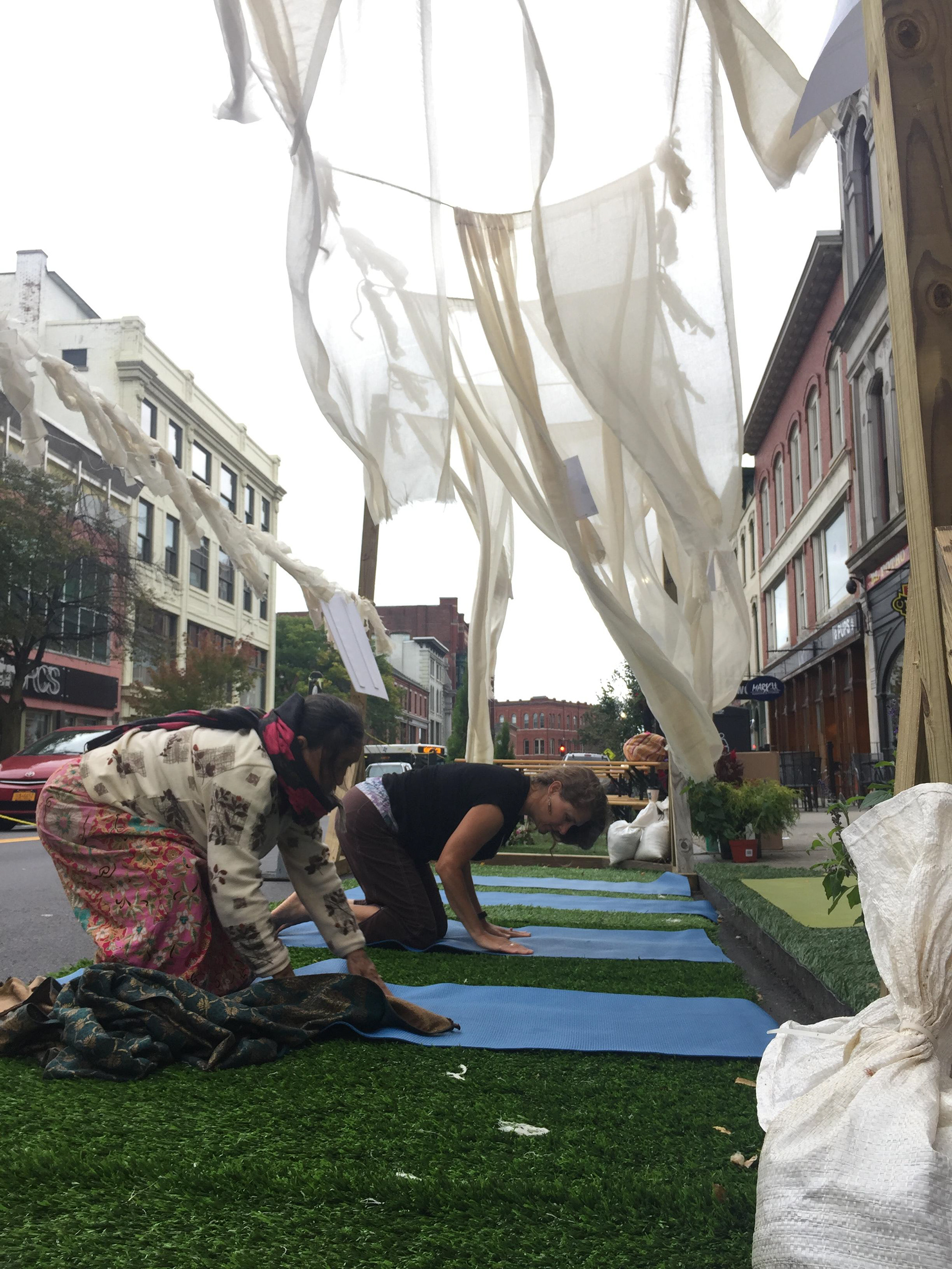 Panels of translucent fabric will be suspended from a 10-foot-high wooden trellis-like structure which the public is invited to wander through. Additionally, scrapbooking materials will be provided for individuals to contribute their own story, memory, or experience to the installation. Finally, participants are instructed to attach their ‘mementos’ onto the suspended panels of fabric. Over the course of the day, the fabric will become increasingly populated with individual stories, serving as a record of this collective activity that you can feel, smell, touch and hear.